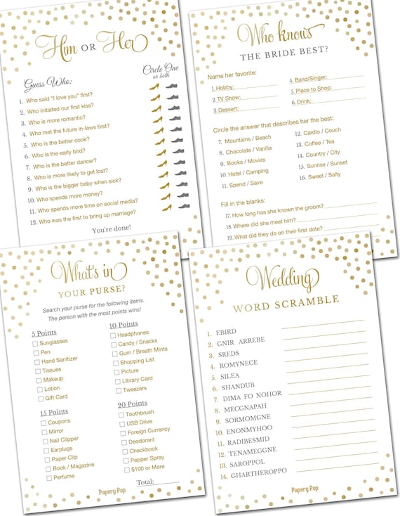 Printed Cards Bridal Shower Games Set Of 4 Activities For Etsy